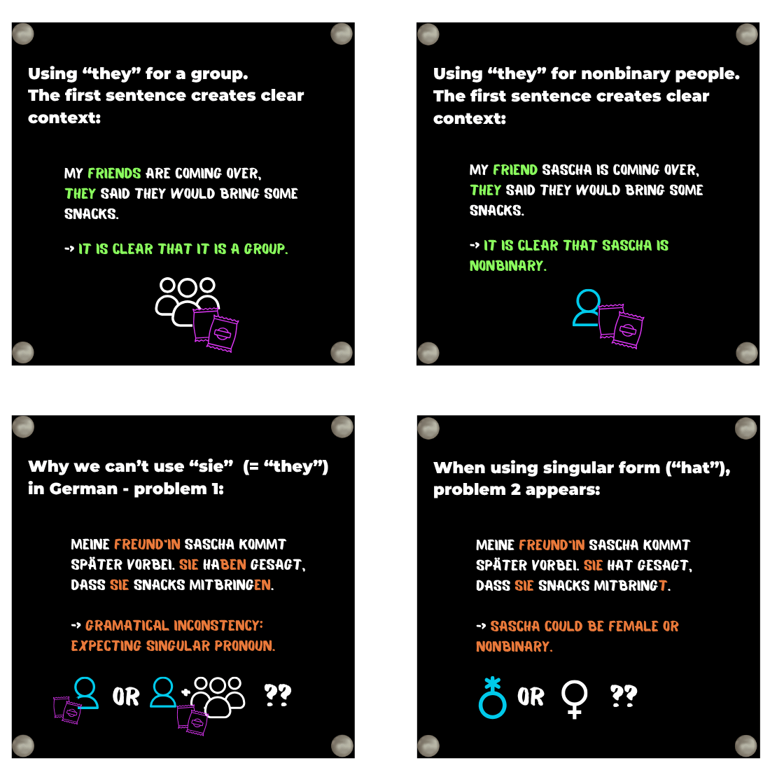 In the previous section, we learned that German is a grammatical gender language, meaning that its nouns play a central role in sentence construction. However, it is important to note that other grammatical components, such as pronouns, also adapt to grammatical gender. Therefore, gendering the noun is only one aspect of creating a nonbinary inclusive language system.Individual gender transitions are characterized by symbolic rituals that highlight the abandonment of the old and the entrance into a new classification system. These rituals include linguistic practices like changing the first name and pronouns or determining self-designations (Lind, 2022).